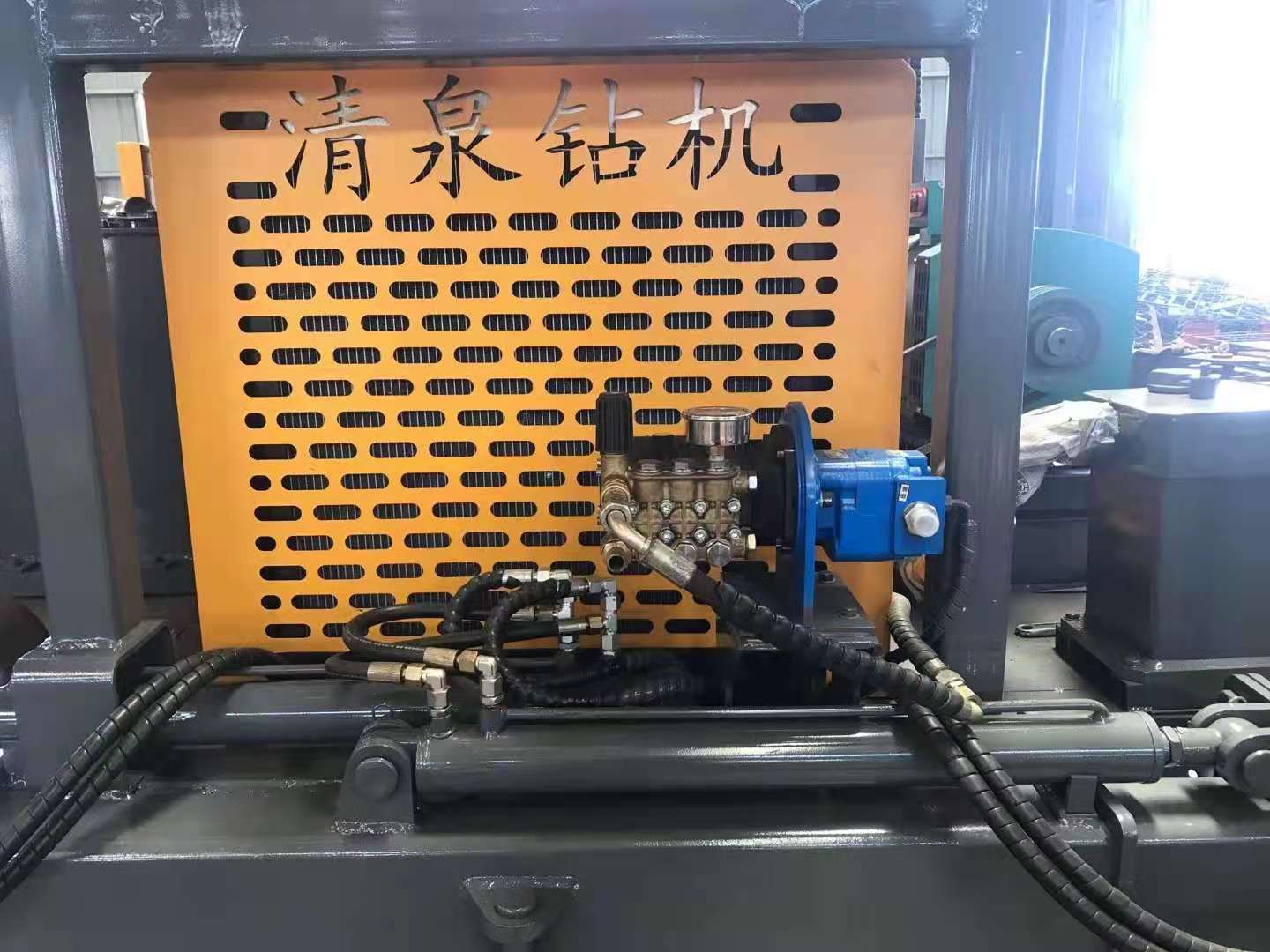 鉆井機(jī)包括活動架體、主工作架、固定支架、卷揚(yáng)機(jī)、油缸、變速箱、泥漿泵、吸氣系統(tǒng)等組成,其中主工作架上設(shè)置滑道板、滑道板開有長孔與圓孔,分別套接在固定支架和活動支架上的轉(zhuǎn)軸上,固定支架上焊有固定滑套,分別套在活動支架的立柱上。