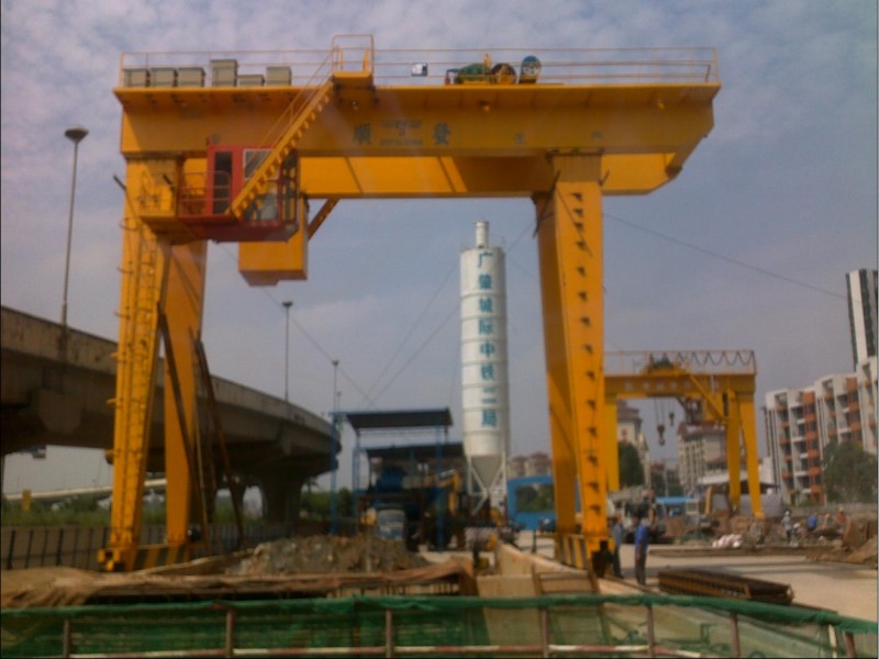門式起重機(jī)是橋式起重機(jī)的一種變形,又叫龍門吊。主要用于室外的貨場、料場貨、散貨的裝卸作業(yè)。它的金屬結(jié)構(gòu)像門形框架,承載主梁下安裝兩條支腳,可以直接在地面的軌道上行走,主梁兩端可以具有外伸懸臂梁。門式起重機(jī)具有場地利用率高、作業(yè)范圍大、適應(yīng)面廣、通用性強(qiáng)等特點(diǎn),在港口貨場得到廣泛使用。